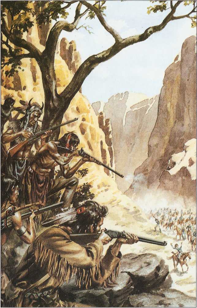 Сражающиеся с превосходящим по численности противником индейские смельчаки защищают женщин, детей и стариков, которые пытаются добраться до канадской границы