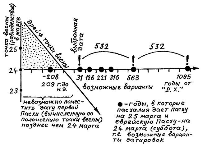 Рис. 34. Наклонная прямая изображает дрейфы даты весеннего равноденствия относительно календаря. Жирные точки указывают те годы, в которые пасхалия дает пасху на 25 марта и еврейскую пасху — на 24 марта (суббота), то есть эти точки дают нам возможные варианты датировок «Рождества Христова».