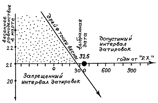 Замечание. Еще раз подчеркнем, что определение даты события по дню весеннего равноденствия — исключительно заманчивый способ датирования лишь на первый взгляд (ввиду чрезвычайной простоты вычислений — всего в одно арифметическое действие). По-видимому, таким способом датирования и ограничивались хронологи XVI–XVII веков (если этот способ был применим в той или иной задаче). Дальнейшего исследования они не проводили и не утруждали себя оценкой возможной ошибки такого метода (мы уже говорили, что в действительности определение точки весны — сложная астрономическая задача). Возможно, если бы средневековые хронологи были более внимательны, привычная нам сегодня хронология выглядела бы другой.