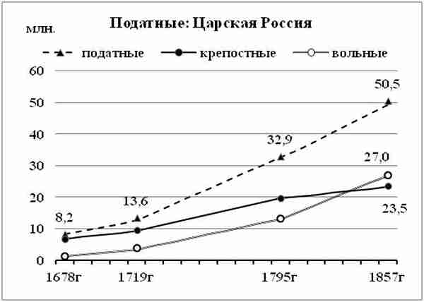 При исследовании демографического развития великороссов во времена крепостного права численность «податных» разделю на две группы: «крепостные» и «вольные».