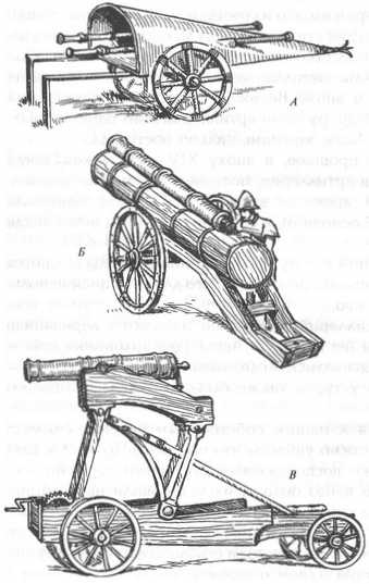 Рис. 3.53. Старинные пушки. А — пушечная повозка, 1544 год. Б — пушка под названием «Политика», 1544 год. В — лафет с подъемным механизмом, XVIII век. Взято из [366:1], с. 9.