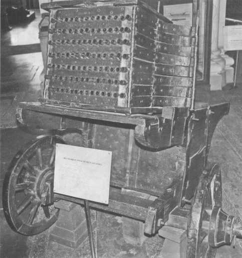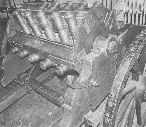 Рис. 3.64. 25-ствольная мортирная батарея калибра 58 мм. Система капитана С. Челокаева. Данный экземпляр изготовлен в 1756 году. На вращающемся барабане закреплено пять рядов кованых стволов, по 5 в каждом. В казенной части стволы каждого ряда для залповой стрельбы соединены общей пороховой полкой.