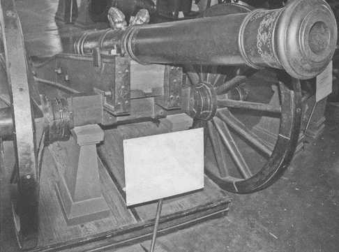Если же вернуться к нашим собственным берегам (то есть Англии — Авт.), то можно увидеть, что при осаде Булони в 1544 году Генрих VIII тоже воспользовался большими деревянными пушками. Перетащив через болото, их установили на позиции, которую осажденные считали немыслимой. Неожиданное появление этих „орудий“ породило панику… Секрет их надежности заключался в том, что под деревянным стволом они имели другой, металлический… С изумлением отмечаем, что в соответствии с описанием, составленным не позднее 1588 года, в запасниках лондонского Тауэра имелась „деревянная пушка, установленная на судовом лафете“. Пушка была известна под названием „Политика“ (рис. 3.53 — Авт.)… К несчастью, сильный пожар 1841 года, длившийся более четырех суток, уничтожил этот уникальный экспонат.
