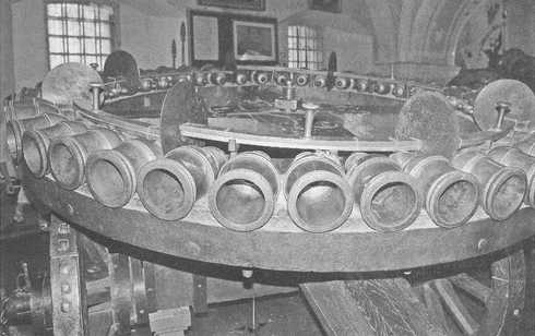 Рис. 3.65. 44-ствольная мортирная батарея калибра 76 мм. Система А.К. Нартова. Данный экземпляр изготовлен в 1754 году. Бронзовые мортиры укреплены на горизонтальном круге диаметром 185 см и разделены на восемь секции. В каждой секции есть своя пороховая полка. Артиллерийский Музей, Санкт-Петербург. Фотография сделана А.Т. Фоменко в 2009 году.