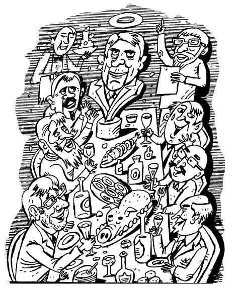 Юбиляру рукоплещут двадцать столов, по восемь гостей за каждым. Что-то скандируют сидящие за главным столом Гос (в недавнем прошлом большой государственный чиновник, ныне сенатор от морозного дотационного региона), Сил (отошедший от дел руководитель силовой структуры), Деп (народный избранник, трехкратный фракционный перебежчик), Преф (не преферансист, но заместитель префекта столичного округа на полтора миллиона человек), Пос (пожизненное «ваше превосходительство», бывший посол в не самых развитых странах).