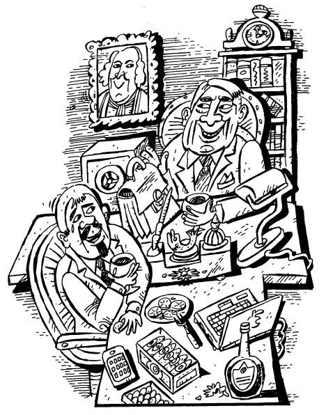 Сначала решали деловые вопросы, для чего помощник отводил вкладчика в специальную комнату, где сидел сотрудник по особым поручениям (родной брат председателя правления). В этой комнате с толстой металлической дверью находились массивный сейф и аппарат для пересчета денег, здесь шуршали фиолетовые, зеленые и красные купюры. И отсюда с чувством исполненного долга гость возвращался в кабинет первого лица.