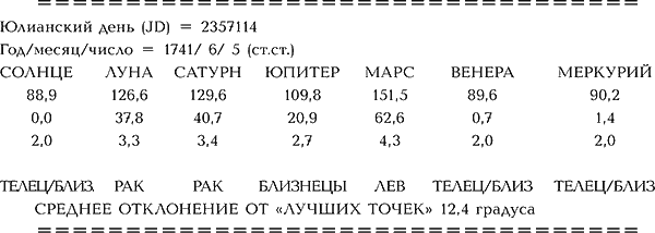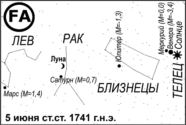 Приведем положения планет на 5 июня старого стиля 1741 года. Дается долгота планет на эклиптике J2000 в градусах, отклонение от Солнца по долготе в градусах, а также положения планет по шкале созвездий и названия созвездий [НХЕ].
