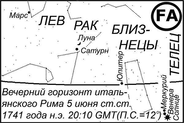 На рис. 7.4 наглядно представлено расположение планет по созвездиям 5 июня старого стиля 1741 года. Хорошо видно, что эта картина неба идеально соответствует зодиаку FA. На рис. 7.5 показано вечернее небо и местный горизонт итальянского Рима 5 июня старого стиля 1741 года в момент захода Юпитера. Юпитер заходил при погружении Солнца под местный горизонт на 12 градусов, то есть почти в полной темноте, см. [НХЕ]. На вечернем небе были видны Юпитер, Сатурн и Луна в Раке, а также Марс во Льве. Еще две планеты — Меркурий и Венера, — находившиеся в Тельце вместе с Солнцем, не были видны из-за близости к Солнцу.