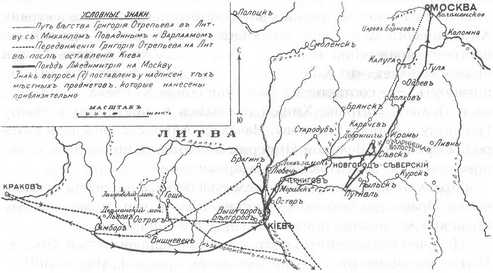 Рис. 7.2. Карта, составленная романовскими историками, и обозначающая путь следования Григория Отрепьева на Литву и Польшу и поход «Лжедмитрия» на Москву. Взято из [578], кн. 2, с. 724.