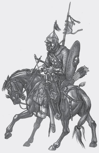 Конный русский воин (середина ХIV в.). Такое вооружение имели как воины московского князя, так и ратники, служившие литовским князьям