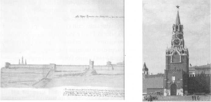 Спаська вежа на гравюрі XVII ст. і сучасний вигляд