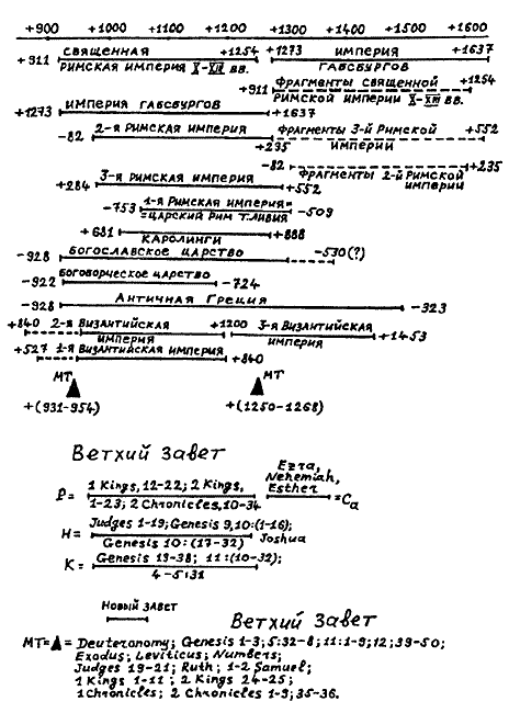 Возникает естественный вопрос: каким должен быть новый «учебник новой короткой истории»? Обнаруженное нами разложение ГХК в сумму четырех коротких хроник позволяет ответить на этот вопрос, правда, пока в довольно общих чертах. Приблизительная схема новой хронологии (и, следовательно, новой истории) показана на рис. 10. Нужно «поднять вверх» и наложить друг на друга все исторические периоды, отмеченные на ГХК одинаковыми буквами-символами. Получится картина, показанная на рис. 12.