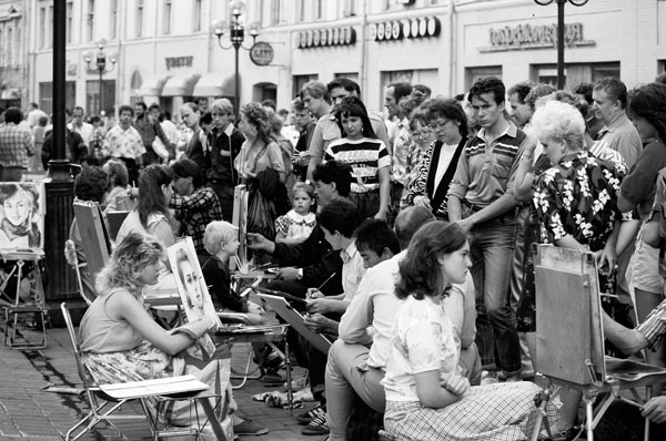 Вскоре перестроенный и «офонаревший» Арбат стал похож на ярмарку. Прямо посреди улицы проходили концерты, в нескольких метрах друг от друга выстраивались танцоры и музыканты. Художники выставляли свои картины и предлагали прохожим тут же нарисовать их портреты.