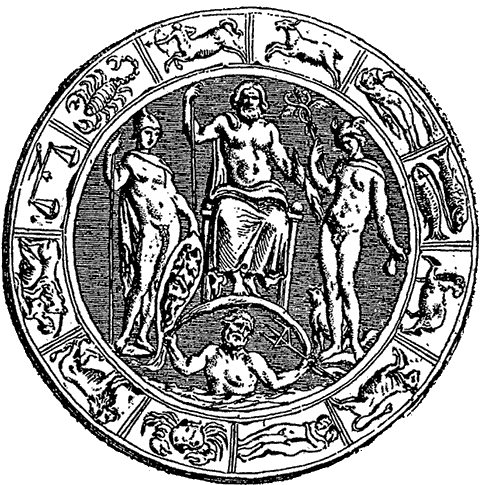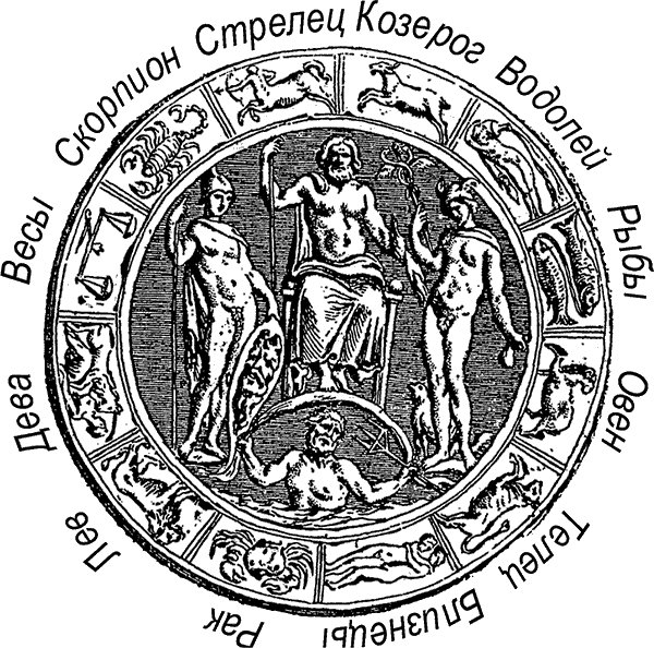 Рис. 7.2. Зодиак FA, изображенный на «античном» резном камне. Планеты изображены здесь в виде фигур, окруженных кольцом из двенадцати созвездий Зодиака. Место каждой планетной фигуры среди созвездий однозначно определено тем, что эта фигура (или группа фигур) «стоит» в определенном созвездии, либо касаясь его ногами, либо «выплывая» из него. Названия созвездий добавлены нами. Взято из [524:1], с. 31, илл. 19.