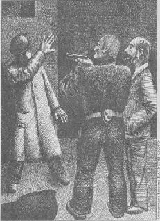 На мгновение человек застыл неподвижно… вдруг его рука метнулась к карману. Раздались выстрелы: бах!.. бах!.. бах!.. бах!.. бах!.. Первая пуля отбросила преступника к стене, после второй он начал сползать вниз…