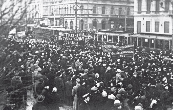 Демонстрация работниц Путиловского завода в первый день Февральской революции.