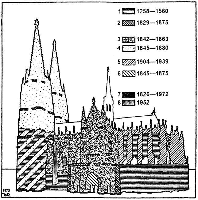 Рис. 36. Хронология каменной кладки знаменитого Кельнского собора. Различной штриховкой показаны части кладки, датированной разными эпохами. Отчетливо видно, что старая кладка ранее XIX века сохранилась только в самом основании собора (горизонтальная штриховка).