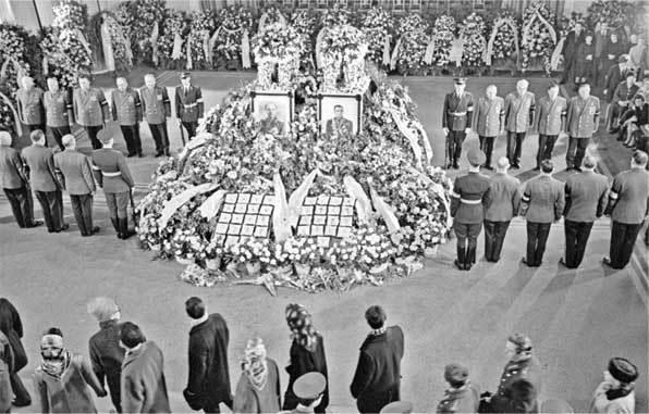 Траурная церемония прощания с летчиком-космонавтом СССР Ю. Гагариным и летчиком-испытателем Владимиром Серегиным в Краснознаменном зале Центрального дома Советской Армии