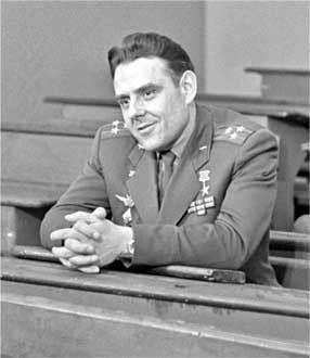 Летчик космонавт СССР, дважды Герой Советского Союза, инженер-полковник Владимир Комаров за своей партой в московской школе № 235