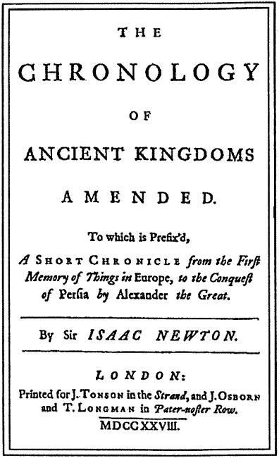 Что же предлагал Ньютон? В основном он проанализировал хронологию Древнего Египта и Древней Греции ранее начала н. э. На анализ более поздних эпох у него, по-видимому, не хватило времени: труд Ньютона по хронологии был опубликован лишь в последний год его жизни.