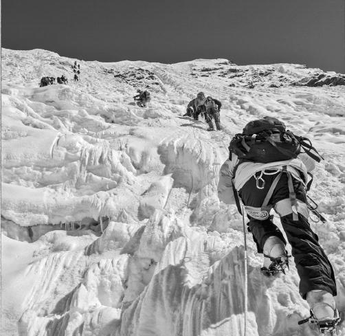 Я стал догонять свою команду и, посмотрев вниз, увидел очередь приблизительно из пятидесяти альпинистов из других экспедиций, двигающихся вверх по веревке. Ближайшие из них находились непосредственно подо мной. Мне не улыбалась перспектива застрять в пробке – это затягивало время нахождения в зоне падающих сверху камней и подвергало другим опасностям. Я решил продвинуться к началу очереди, пока это еще возможно, и прибавил шагу. Но вверх по стене Лхоцзе была протянута только одна страховочная веревка, поэтому обогнать медленных альпинистов оказалось не так просто.
