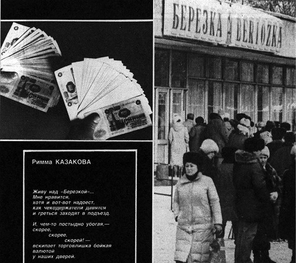 Итак, позиция статьи в «Аргументах и фактах» строилась на трех отчасти противоречащих друг другу тезисах. Первое: «Березки» нужны, чтобы приносить государству необходимую валюту. Второе: «Березки» существуют для того, чтобы привилегированно снабжать загранработников, работающих в тяжелых условиях. Третье: привилегированного снабжения в «Березках» нет — все то же можно найти в обычных магазинах.