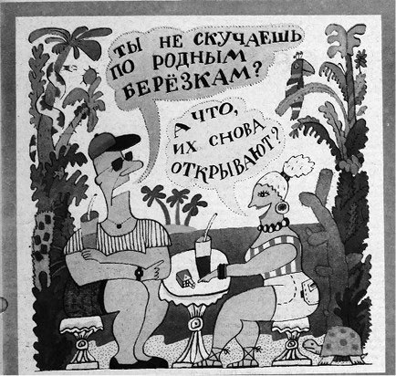 В открытых советских источниках вплоть до второй половины 1980-х тема «Березок» никогда не обсуждалась как проблемная. Более того, сама практика пользования этими магазинами была негласной. Однако чем большее распространение получали магазины и чем больше людей о них знало, тем чаще упоминания о них просачивались в прессу. Например, статья 1976 года в сатирическом журнале «Крокодил» рассказывала о незаконном рынке-барахолке в подмосковном городе Бронницы. «В десяти шагах от нас, не стесняясь милиционера, яркий представитель современной барахолки предлагал новую дубленку. ‹…› Интересуюсь ценой. — Семь с половиной бумаг! — коротко бросает он. — А если дешевле? — Дешевле в “Березке”»[673]. Никакого объяснения, что такое «Березка», не следует, однако из контекста видно, что это источник дефицитных благ, менее доступный, но более выгодный, чем барахолка, — но главное, видимо, хорошо известный читателю.