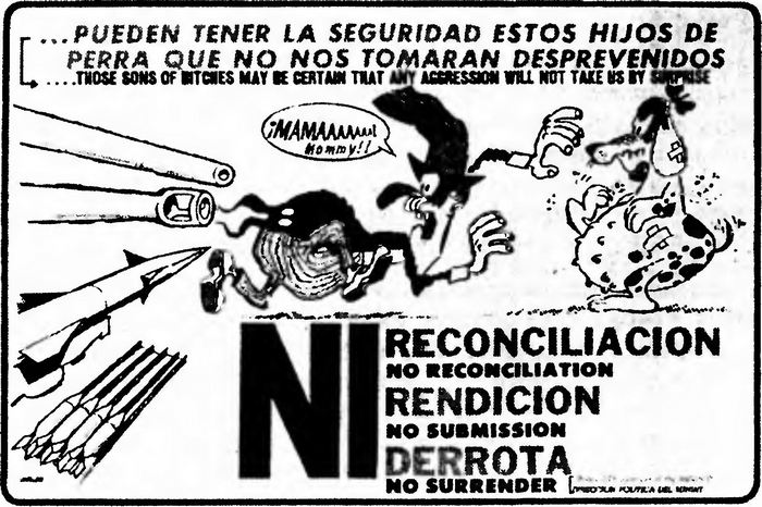 Кубинский правительственный плакат 1968 года. Вверху надпись: «Эти сукины дети могут быть уверены, что никакая агрессия не застигнет нас врасплох».