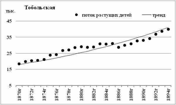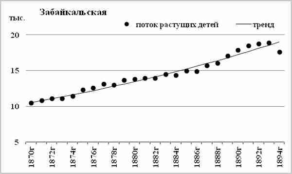 Поток растущих детей Забайкальской области существенно более равномерный, чем потоки Томского округа и Иркутской губернии. Ежегодный прирост потока растущих детей в Забайкальской области — около 2,5%.