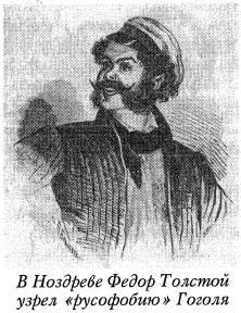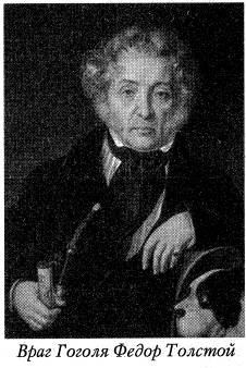 Среди них особенно выделялся комичной колоритностью граф Федор Толстой по кличке Американец. Друг писателя Аксаков даже вспоминал, что Толстой однажды заявил, будто Гоголь — «враг России и что его следует в кандалах отправить в Сибирь». Еще один пример недоброжелательности Толстого приводит в письме к Николаю Васильевичу Смирнова: «Разговорились о духе, в котором написаны ваши „Мертвые души“, и Толстой сделал замечание, что вы всех русских представили в отвратительном виде, тогда как всем малороссиянам дали вы что-то вселяющее участие, несмотря на смешные стороны их; что даже и смешные стороны имеют что-то наивно-приятное; что у вас нет ни одного хохла такого подлого, как Ноздрев; что Коробочка не гадка именно потому, что она хохлачка».