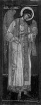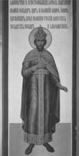 Кроме того, изображение креста на иконе искажено: здесь оставлен слой записи, возвышающийся над уровнем первоначальной живописи. В. И. Антонова считает, что «при чинках непопулярный в иконной живописи Мономах был понят как царь Константин… Киноварная буква «а», уцелевшая между скипетром и несколько измененной теперь из-за вставки левкаса вверху шапкой, позволяет думать, что и в надписи был указан [Вл] а [димир], а не Константин – «Костянтин»; в этом имени по транскрипции XVI в., нет буквы «а». Слово же «царь» в то время писалось обычно с титлом «цръ».[356]