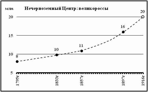 Дальнейшее развитие Нечерноземного Центра полезно оценивать в двух ключевых интервалах: «расцвет» крепостного права и «накануне» падения Царства Романовых. Это можно рассмотреть графически на интервале с 1795 по 1916 годы. В Нечерноземном Центре великорусский язык общения составлял около 95%. Хотя данные численности великороссов в Нечерноземном Центре по публикациям имеют отклонения, но демографическое развитие следует оценивать на длинном тренде, диаграмма 5.12.