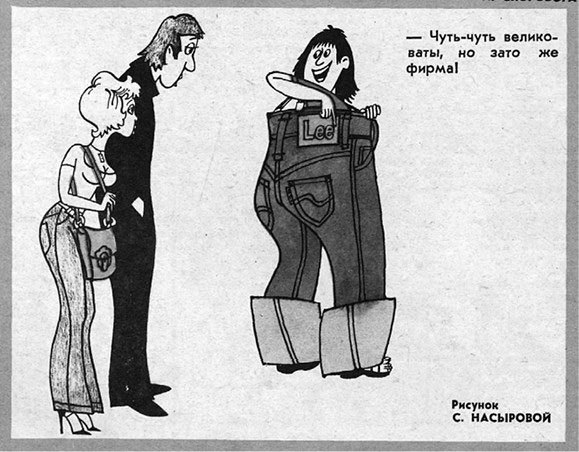 Карикатура из журнала «Крокодил» о популярности джинсов. Крокодил. 1978. № 27. С. 8