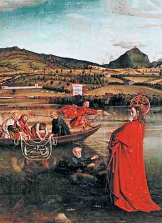 Рис. 1.57. «Чудесный улов рыбы». Конрад Виц. Алтарь Святого Петра. Якобы 1444 год. Здесь «соединены евангельские рассказы о чудесном улове и о том, как Христос, идя по водам Галилейского моря (Генисаретского озера), призвал к себе Петра, но тот стал тонуть, потому что сомневался» [143:0], с. 87. Взято из [143:0], с. 87.