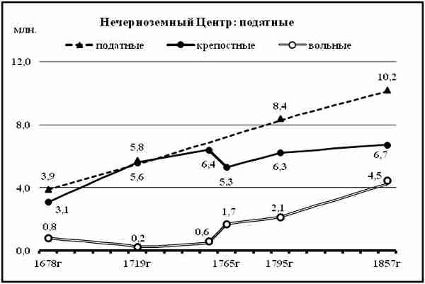 А доля «крепостных духовенства» была в те годы существенная — 17%. Причем в Нечерноземном Центре было более 1,0 млн. — почти 60% всех «крепостных духовенства». Поэтому при оценке динамики податных «вольных» и «крепостных» факт изменения социального статуса «крепостных духовенства» нужно учитывать обязательно. До 1765 года «крепостные духовенства» учтены в численности «крепостных». А с 1765 года бывшие «крепостные духовенства» учтены в численности «вольных».