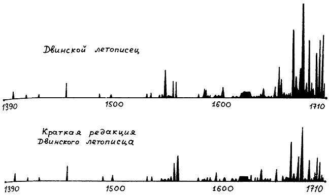 Рис. 14. Графики объемов зависимых летописей: Двинского летописца и его краткой редакции. Оба графика делают всплески практически одновременно.