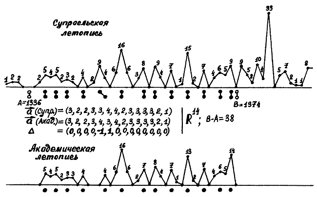 Принцип корреляции максимумов был также успешно применен к анализу некоторых русских летописей периода «смуты» конца XVI — начала XVII века н. э. См. на эту тему работы Л.Е. Морозовой и А.Т. Фоменко [902], [548]. В этом исследовании большое участие принимал также Н.С. Келлин. Полученные результаты изложены в [ХРОН2], гл. 5:2.