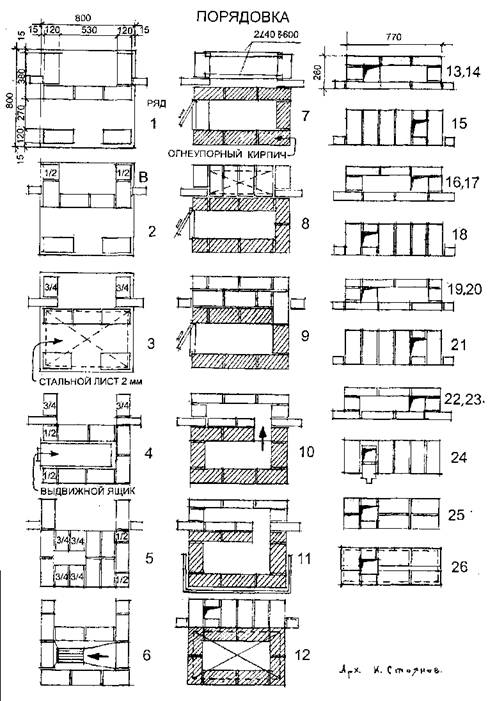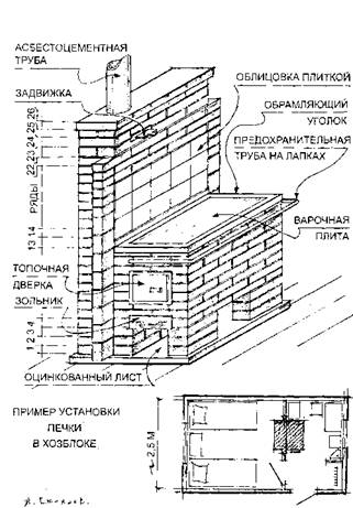Освоение дачного или садового участка обычно начинают с установки временного хозблока, который после переселения в «большой» дом становится сарайчиком или идет на слом. Но не спешите ломать хозблок – всякое временное строение в дальнейшем может пригодиться для наездов в холодное время. Для отопления большого дома надо много дров и времени. Кроме того, прогревание промерзшего здания за короткое время угрожает быстрым разрушением деревянных конструкций от конденсата. Для зимних приездов на один или несколько дней лучше оборудовать утепленную комнатку с небольшой простой отопительно-варочной печкой. Каждый, используя приводимую порядовку, не имея какого-либо строительного опыта, сможет сложить такую печку своими руками за 2-3 дня.