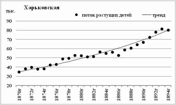 Харьковская губерния примыкает к Курской, Воронежской губерниям и Области Войска Донского. Но провала в потоке растущих детей Харьковской губернии фактически нет. Неравномерность прироста относительно линейного тренда — заметно меньше. Ежегодный прирост потока растущих детей Харьковской губернии — около 3,5%.