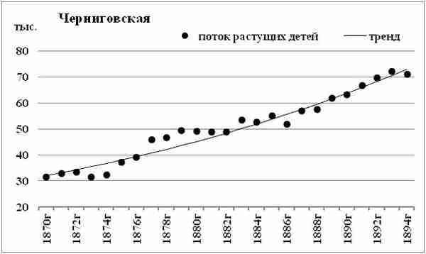 Поток растущих детей Черниговской губернии имеет колебательный характер. Явного провала начала 1890?х в потоке Черниговской губернии нет. Ежегодный прирост потока растущих детей Черниговской губернии, в среднем — около 3,5%.