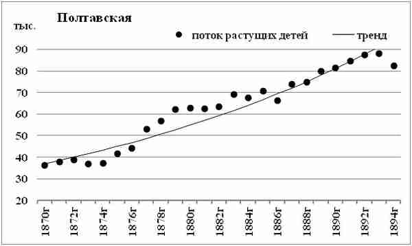 Поток растущих детей Полтавской губернии подобен потоку Черниговской губернии. Примерно такая же неравномерность потока. Ежегодный прирост потока растущих детей Полтавской губернии оценивается — около 3,5%.