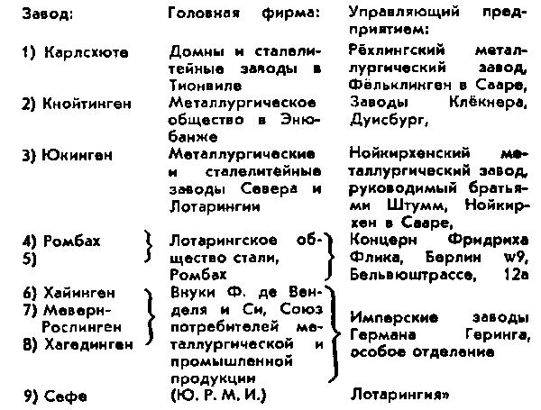 «Господин рейхсмаршал... распорядился, чтобы находящиеся в округах Лотарингия и Люксембург металлургические заводы впредь находились по поручению рейха под присмотром и руководством отдельных лиц или пригодных для осуществления руководства предприятий и чтобы они функционировали на свой страх и риск. Этим управляющим, если не наступит, в силу соответствующих обстоятельств, изменение обстановки, должна быть дана возможность приобрести руководимые ими заводы. При этом они должны взять на себя обязательство ни частично, ни полностью не продавать полученное имущество третьим лицам непосредственно или через посредников без согласия рейха.