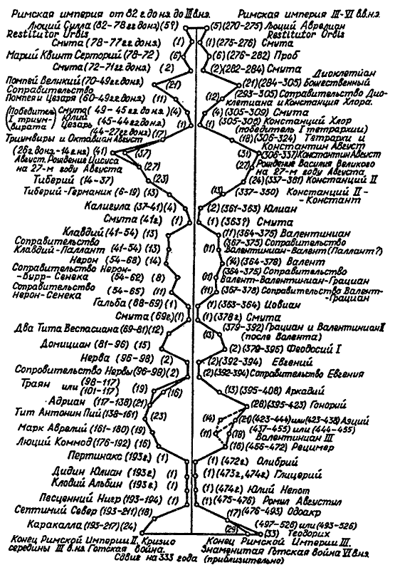 Примечание. Здесь заканчивается обнаруженный нами параллелизм между Римской империей Цезаря (82 год до н. э. — 217 год н. э.) и Римской империей Диоклетиана (270–526 годы). Обнаружен он был с помощью «методики распознания династий». После этого вполне естественным было сравнить — опять-таки с помощью ЭВМ — анкет-коды соответствующих личностей. Совпадающие детали их биографий, которые здесь приведены, в большинстве случаев как раз и являются результатами этого сравнения. Воистину поразительна та схожесть, с какой в Империи Диоклетиана один властитель за другим, без перерывов, повторяет, с незначительными отклонениями, биографическую канву своего двойника из Империи Цезаря — на протяжении 256 лет подряд! Конечно же, нам интересно было бы заглянуть и в более поздние времена этих империй: нет ли и там совпадений? (Быть может, труднее формализуемых, то есть таких, которые ЭВМ зафиксировать пока не может.) Обнаружилось: есть. Параллелизм, хотя и не такой явный, продолжается и дальше, охватывая годы 217–235 и 526–536.