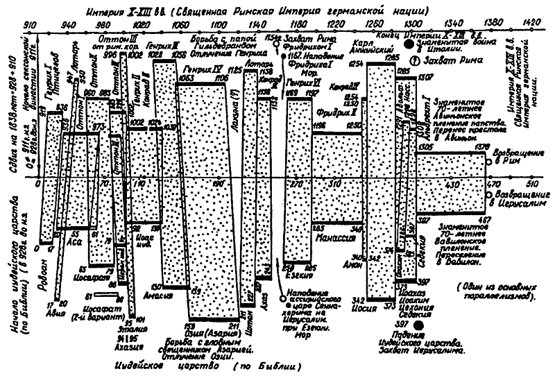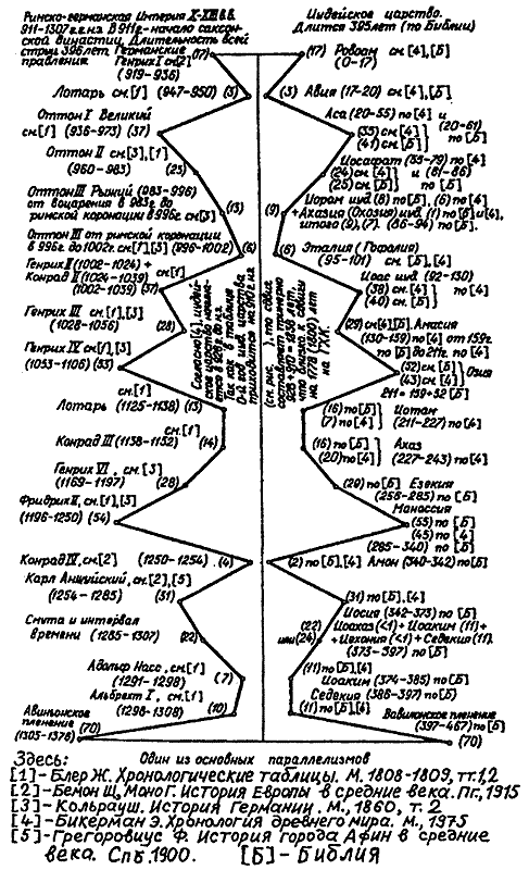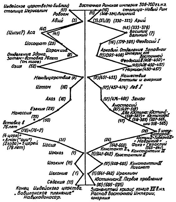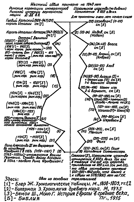 Итак, мы мысленно обозрели только один из нескольких десятков параллелизмов, обнаруженных в европейской и библейской истории, причем даже не из числа основных — из вторичных. Однако он один из самых длительных и интересных. Хотелось бы надеяться, что читатель сам смог убедиться: такая цепь совпадений случайной быть не может. Она — результат искажений реальной истории, не обязательно умышленных и злонамеренных, результат дилетантской, неквалифицированной (если рассматривать в аспекте профессиональном) работы какого-то средневекового историка-хрониста.