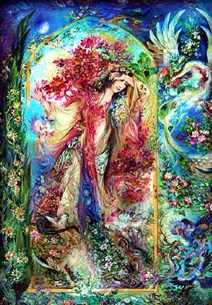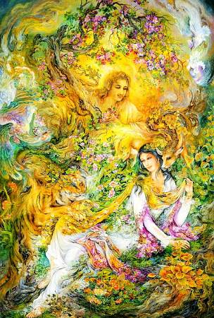 Но чаще всего, центр картины отдан женской фигуре, вокруг которой буйство декора из цветов, птиц, животных, сквозь который просматриваются другие фигуры, какие-то образы даны лишь намеком. Добавляет интриги, порой, и название работы, боюсь, не всегда мне удается правильно его перевести, тем более, что названия ранних работ уже были переведены на английский с персидского.
