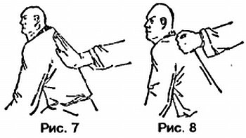 Прием заключается в постукивании ладонью или кулаком по соответствующим участкам тела и конечностей (рис. 7, 8). «Постукивание», как и предыдущие приемы, может быть «пополняющим», «ослабляющим» и «нейтральным».