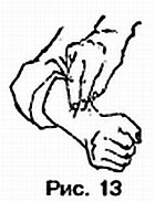 Прием заключается в защипывании мышцы или связки большим, средним и указательным пальцами и их перемещении вверх — вниз или влево — вправо (рис. 13). «Защипывание» может быть «пополняющим» или «ослабляющим».
