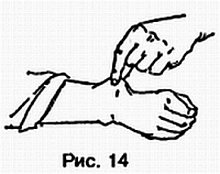 Прием заключается в прищипывании точки или мышцы с двух сторон указательным и средним пальцами (рис. 14). Большое усилие при «прищипывании» вызывает «ослабление», слабое усилие — «пополнение», среднее — «нейтральную» реакцию.