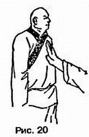 Прием заключается в вибрирующем воздействии пальцами или ладонью на кожу или биологически активную точку (рис. 20). «Встряхивание» вызывает волны вибрации, захватывающие небольшой участок кожи и окружающие ткани, что способствует «прочищению» энергетических каналов, улучшению циркуляции ци и крови, снятию спазмов и судорог. Регулярное использование приема для воздействия на точки, связанные с различными внутренними органами, улучшает их функционирование, ускоряет обмен веществ и, следовательно, вызывает аппетит и поднимает состояние духа.