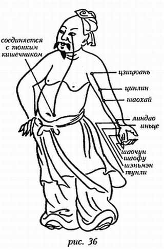 Ручной шао-инь меридиан сердца (рис. 36) берет начало в сердце и выходит из него, образуя «систему сердца», включающую три ветви. Основной ствол канала выходит из сердца и поднимается вверх в легкие.